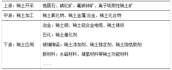 稀土产业链主要由稀土资源开采,稀土材料制备,以及稀土应用领域构成。其中:稀土资源开采主要涉及的稀土矿物有氟碳铈矿、独居石、磷钇矿,以及离子吸附性稀土矿;稀土材料制备包括精矿分解以及冶炼;稀土应用领域包括冶金、军事、石化、玻璃陶瓷、农业、新材料等领域,是我国关键的战略性资源。