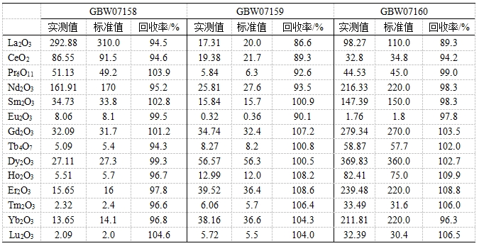 参考《GB/T 40798 离子型稀土原矿化学分析方法 稀土总量的测定 电感耦合等离子体质谱法》,采用氢氟酸、硝酸、高氯酸进行湿法消解。利用碰撞反应模式控制氧化物产率,降低轻稀土氧化物/氢氧化物对其他稀土元素的干扰;并根据实际样品中元素含量,校准稀土氧化物/氢氧化物的干扰。对三个稀土矿标准物质中14种稀土元素(以氧化物形式表示)进行测试,各元素回收率为86.6 %~109.9%。