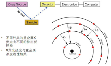 X射线荧光光谱技术(XRF)的原理见图3所示,可以直接检测固体或液体样品中ppm量级的元素成分。采用富集后再检测的办法,使得XRF技术对空气颗粒物中的重金属成分的检测限优于0.001ug/m3。而常规实验室的检测技术,由于预处理消解过程中需要将微克量级的样品溶解到几十克的液体中,而使得浓度被稀释百万倍,从而多数仪器(譬如ICP-AES、或原子吸收光谱仪)无法检出元素含量低于10ug/m3量级的空气颗粒物样品。
